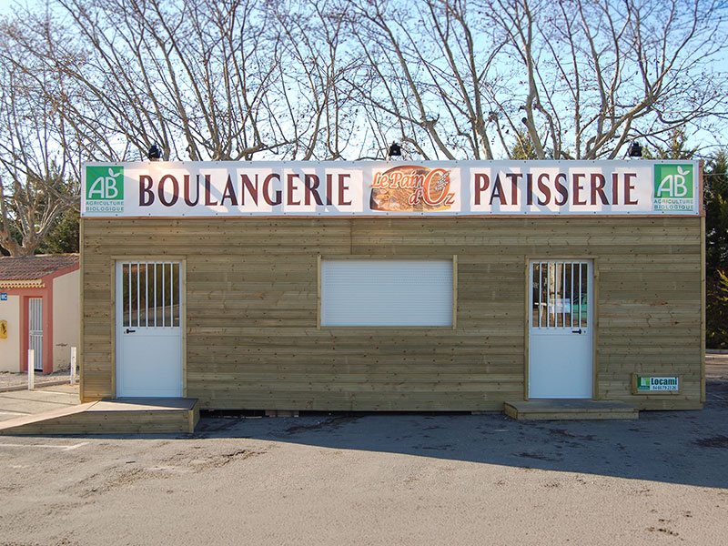 Pendant les travaux de rénovation de la boulangerie, un point de vente provisoire a été mis en place, avec un habillage bois pour rappeler le côté naturel du pain